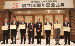一般財団法人 家電製品協会(槙公雄理事長・ソニー代表取締役社長兼CEO)は3月7日、帝国ホテル東京(東京都千代田区)で創立50周年記念式典を開催した。電機メーカーを中心とする賛助会員のほか、経済産業省など関係省庁、消費者団体、流通団体、関係工業会など、家電産業の関係者約450人が出席した。ユニバーサルデザインの開発普及、家電リサイクルの高度化、家電に携わる人材の育成など、協会の事業活動に貢献した…